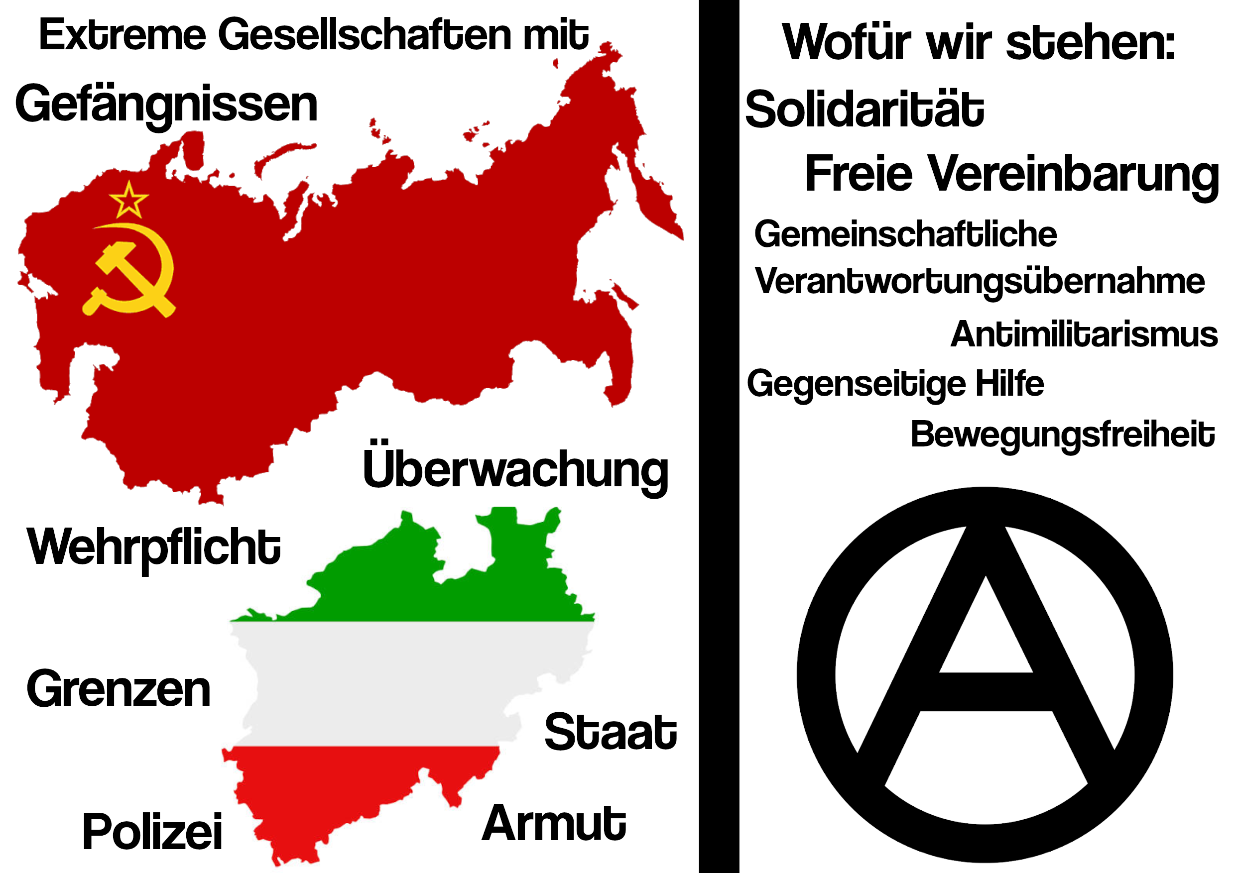 Wir lehnen es ab den Staat als Mittel zu nutzen. Für uns ist der Staat das Extrem. Er dient zur Absicherung der Herrschaft einer Elite auf Basis der Unterdrückung und Ausbeutung der restlichen Bevölkerung.